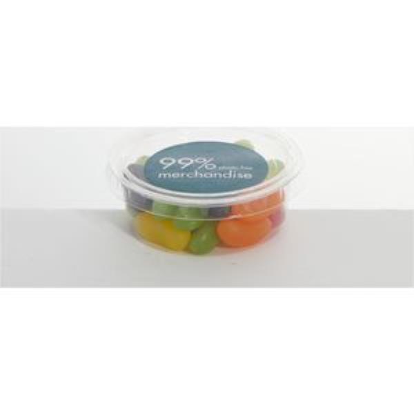 Mouth watering assorted Jelly Beans in branded compostable sugar cane pot. A mini 25g fill with full colour digital label to create an ethical and fun giveaway.
