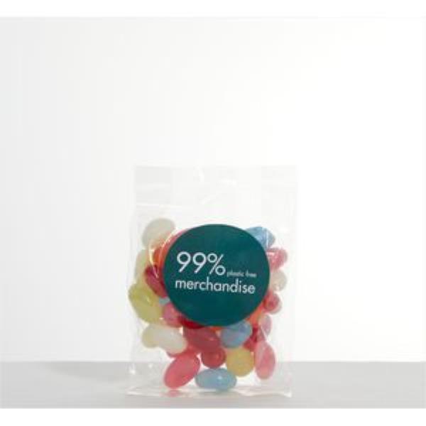 Delicious gourmet jelly beans in branded compostable/dissolvable sugar cane bag. A large 50g fill with full colour digital label to create an ethical and fun giveaway. Available in a range of 8 flavours and colours to compliment your brand or message.
