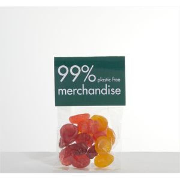 Vegan fruit gums are utterly delicious and totally more-ish. A large 50g in branded compostable/dissolvable sugar cane bag. Full colour digital label to create the ultimate ethical giveaway.