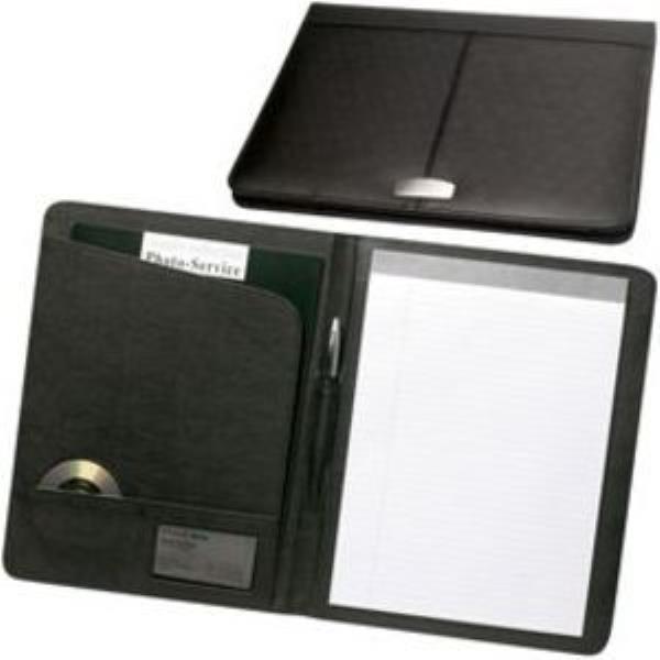 Black stitched leather conference folder with PU internal document pockets and a note pad. An excellent value product with a perceived high value.
