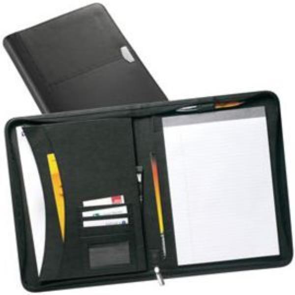 Quality stitched leather zipped conference folder with several PU internal document and business card pockets, pen loop and A4 note pad included.