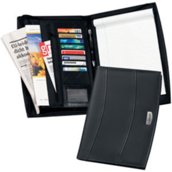 Zipped leather A4 conference folder with distinctive curved edge, various internal document and business card pockets, A4 note pad and ballpoint pen included. Individually boxed.