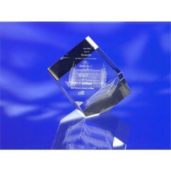 3D laser engraved award. Any image be it a complex engine or simply a company logo can be lasered in 3D within the optical glass block. Hundreds of thousands of pixels make up any one image. The result is a masterpiece of finesse and elegance.