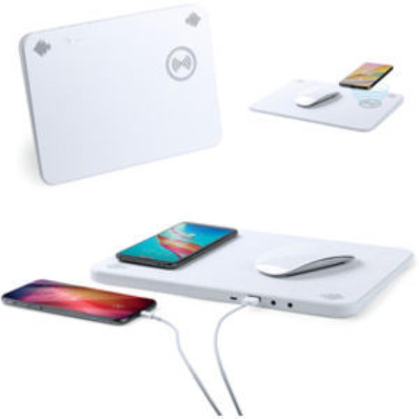 Multifunction, wireless charging, mousepad. Bluetooth connectivity, with integrated speakers and line input jack 3.5mm. In an elegant white colour design, with ON/OFF button and charging status indicator. 4,000 mAh charging capacity, with USB output and rechargeable via micro USB cable included. 2 x 2W, stereo, integrated, speakers and hands free function. Wide, easy printing area and presented in an attractive, individual, design box.