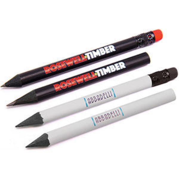 Mini pencil eraser, printed full colour or laser engraved to the shank. Logo area 60 mm wide x 5 mm high. Free origination. Charge is per pencil. MOQ 100