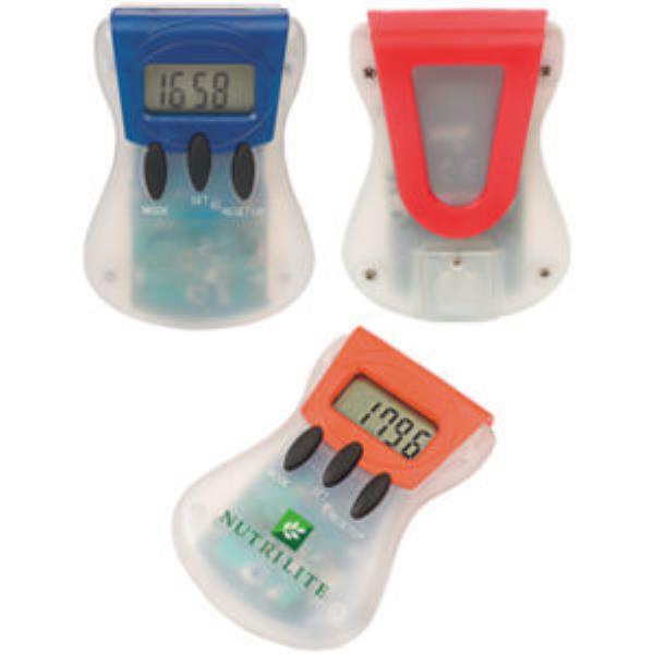 Translucent pedometer with step counting, distance travelled and calories burnt counter.