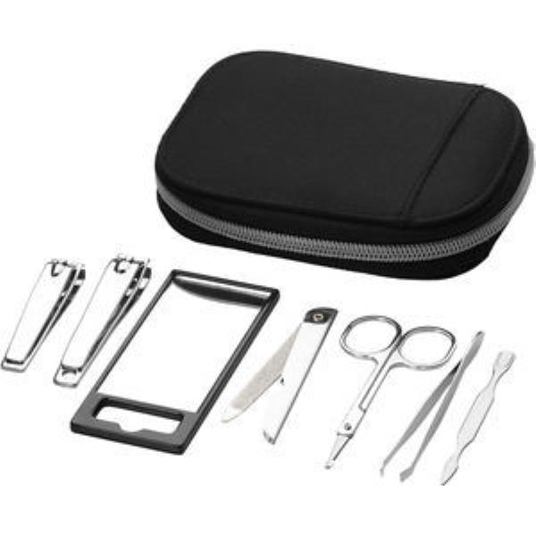 Make sure you always look your best. This set includes a mirror tweezers a nail clipper a toe nail clipper a pair of scissors a nail file and a cuticle tool. The set comes in a handy nylon pouch. Microfiber nylon