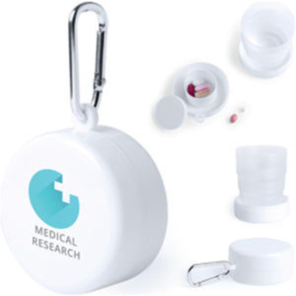 Bold folding cup for emergencies. In an elegant white colour, including lid with integrated pill holder, with metal carrying carabiner.