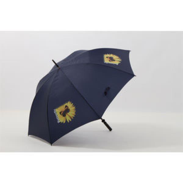 76cm, 8 rib golf umbrella. Metal frame, fibre glass solid ribs, polyester panels. Black plastic pistol grip handle.
