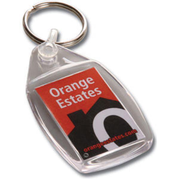 Clear acrylic keyring with full colour printed insert. A choice of 10 coloured fittings available. Perfect for house or car keys - a popular and useful promotional item with a good sized insert for any promotional message