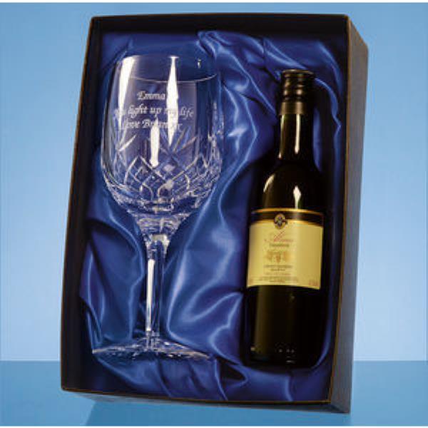 The Lead Crystal Goblet and Red Wine set would be a great gift for a birthday or graduation. The goblet has diamond cut detail and an engraving area which can be personalised with any crest, logo or wording. This gift set is presented in a satin lined box and is sure to be treasured and enjoyed by the recipient.