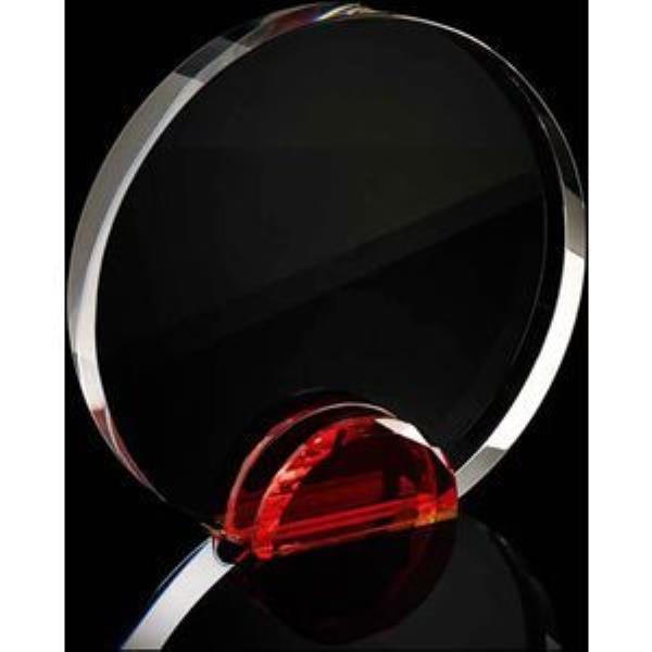 Large round crystal frame with red crystal stand supplied in a satin lined box.