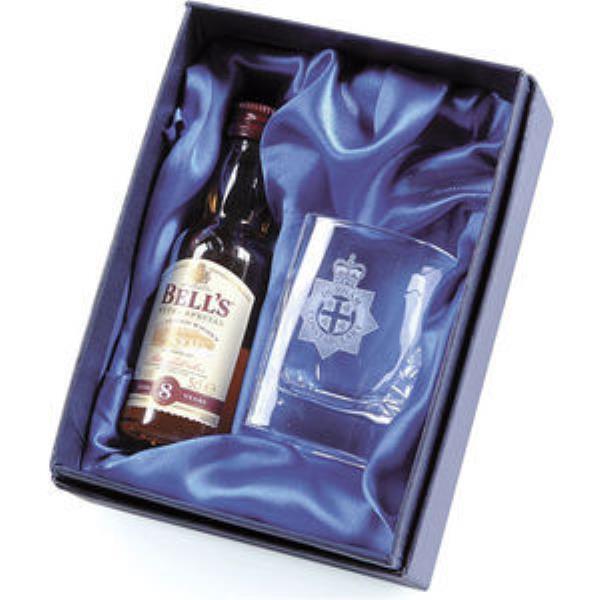 Crystal square tot glass and a 5cl miniure bells whisky supplied in a Satin lined box.