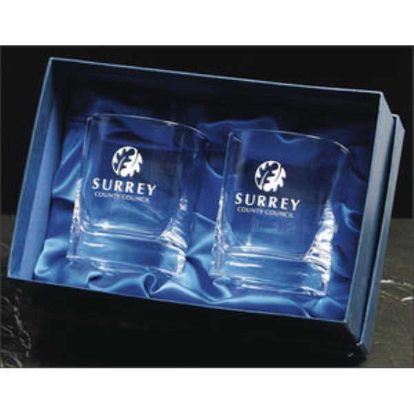 Pair of large crystal square tumblers 10oz, supplied in a satin lined box. Perfect executive gift. Also available Bulk packed.