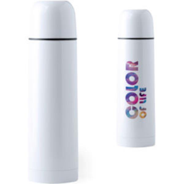 500ml capacity thrernal bottle with body in resistant, stainless steel. Outside with special coating, especially designed for sublimation printing. Screw on security lid and presented in an attractive, individual box.