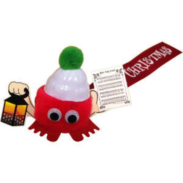 Carol Singer Logobug, holding a Lantern and Sheet Music and printed with your Promotional message on Ribbon. Part of our Seasonal Range of Logobugs. Carol Singer joins Santa, Snowman, Reindeer and Glitter Angel to make an excellent Festive Campaign give-away.