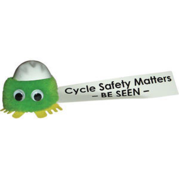 Original Advertising Logobug with Cycle Helmet and your promotional message printed on Ribbon in Full Colour. Part of our extensive Hatter Logobug Range - makes an ideal and collectable give-away for a Bike Safety Campaign. Available in a large range of Pom and Feet Colours to suit your Branding.