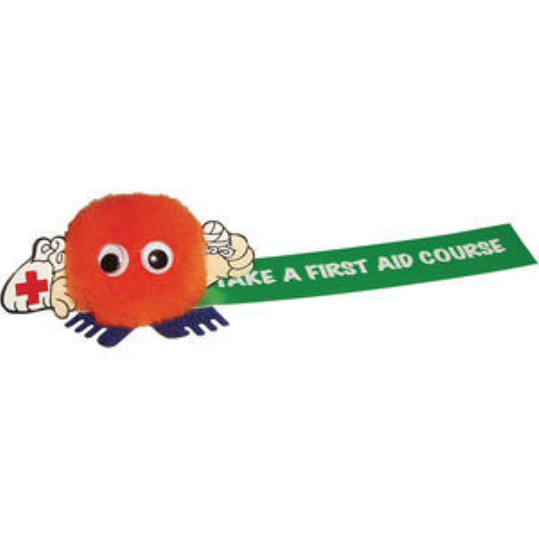 First Aid Logobug with your promotional message printed on Ribbon. Part of our extensive Hand Holder Logobug Range - makes an excellent give-away for a First Aid Training Health & Safety Campaign. Choose from a large selection of Pom and Feet Colours to suit your Branding.