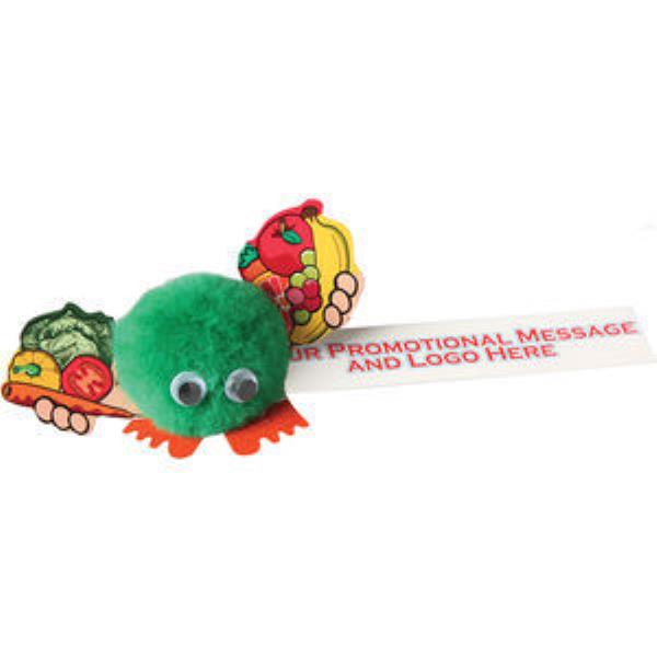 Logobug holding a selection of Fruit and Vegetables - with your promotional message printed in Full Colour on Ribbon. Part of our extensive Hand Holder Logobug Range - this Logobug is an ideal give-away for a Healthy Eating Fitness Campaign. Choose from our large selection of Pom Colours and Feet to suit your Branding.