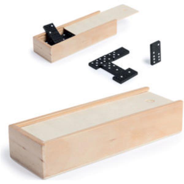 Classic domino game with 28 pcs. Made of wood, with pieces in an elegant black colour with white colour details. Presentes in an individual wooden case.