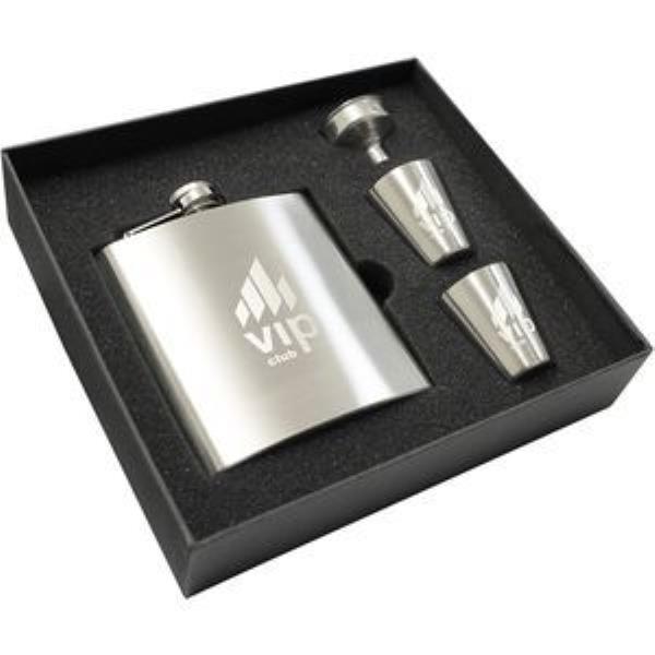 A fabulous contemporary 6oz stainless steel hip flask in a brushed silver finish presented with a funnel and 2 cups. Presented in a deluxe gift box.