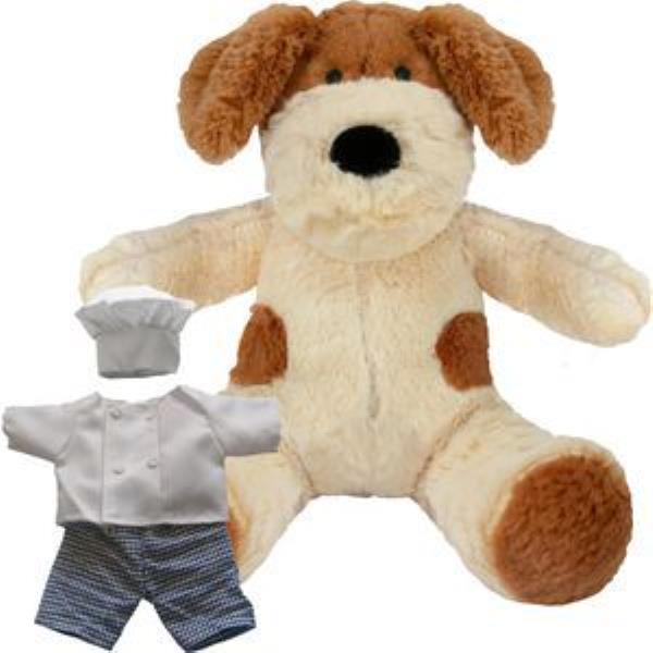 BLANK PLUSH SOFT TOY 20CM DARCY DOG with Chef Outfit. Darcy Dog Plush Toy Suitable for All Ages. with Machine Embroidered Eyes. White Hat & Jacket, Gingham Trousers, Sitting Height 20cm Approx. Minimum Quantity: 10.