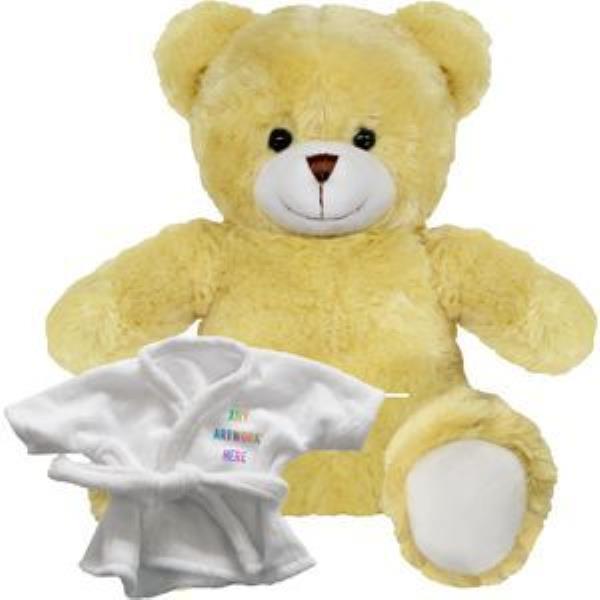 BLANK PLUSH SOFT TOY 25CM ELIZABETH TEDDY BEAR with Dressing Gown. Elizabeth Plush Toy Bear Suitable for Age 3. with Glass Studded Eyes. White Robe with Tie Cord, Sitting Height 25cm Approx. Minimum Quantity: 10.