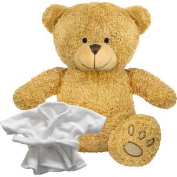 BLANK PLUSH SOFT TOY EDWARD II TEDDY BEAR with Dressing Gown. Suitable for All Ages, Machine Embroidered Paws & Facial Features, White Robe with Tie Cord, Seated Height 22cm Approx, Golden Yellow Colour Fur - Available in Two Colours. Minimum Quantity: 10.