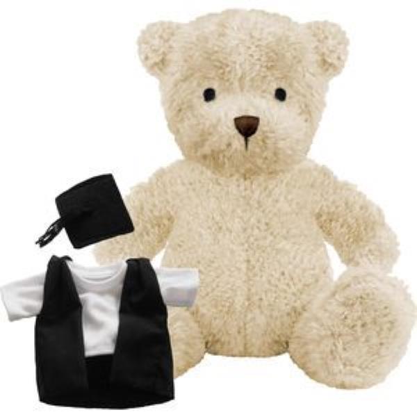 BLANK PLUSH SOFT TOY JAMES III TEDDY BEAR with Graduation Outfit. James Iii Plush Toy Bear, Suitable for All Ages, Machine Embroidered Facial Features, Black Mortar Board Cap & Graduate Gown, Seated Height 17cm Approx, White Colour Fur - Available in 3 Colours. Minimum Quantity: 10.