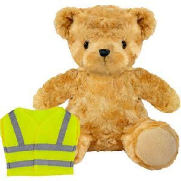 BLANK PLUSH SOFT TOY 19CM VICTORIA TEDDY BEAR with Hi-vis Vest. Victoria Plush Toy Bear Suitable for Age 3. has Luxurious Rose, Swirl Embossed Plush Fur & Glass Studded Eyes. Yellow with Silver Reflective Stripe, Sitting Height 19cm Approx. Minimum Quantity: 10.