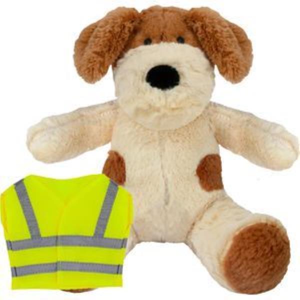 BLANK PLUSH SOFT TOY 20CM DARCY DOG with Hi-vis Vest. Darcy Dog Plush Toy Suitable for All Ages. with Machine Embroidered Eyes. Yellow with Silver Reflective Stripe, Sitting Height 20cm Approx. Minimum Quantity: 10.