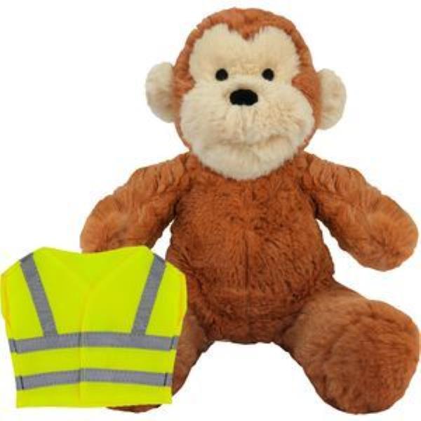 BLANK PLUSH SOFT TOY 20CM MAX MONKEY with Hi-vis Vest. Max the Monkey Plush Toy Suitable for All Ages. with Machine Embroidered Eyes. Yellow with Silver Reflective Stripe, Sitting Height 20cm Approx. Minimum Quantity: 10.