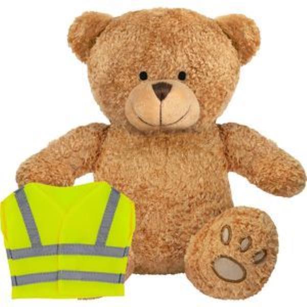BLANK PLUSH SOFT TOY EDWARD I TEDDY BEAR with Hi-vis Vest. Suitable for All Ages, Machine Embroidered Paws & Facial Features, Yellow with Silver Reflective Stripe, Seated Height 22cm Approx, Brown Colour Fur - Available in Two Colours. Minimum Quantity: 10.