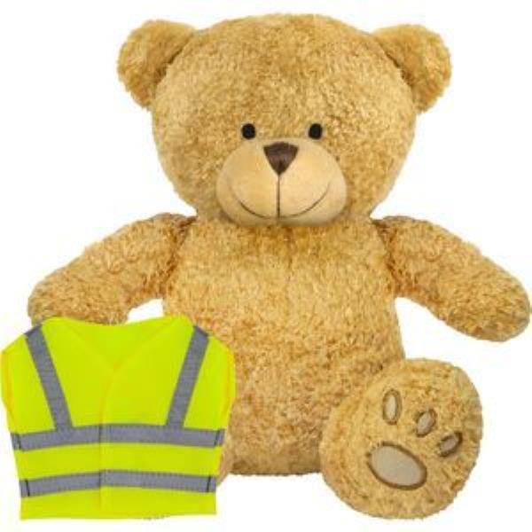 BLANK PLUSH SOFT TOY EDWARD II TEDDY BEAR with Hi-vis Vest. Suitable for All Ages, Machine Embroidered Paws & Facial Features, Yellow with Silver Reflective Stripe, Seated Height 22cm Approx, Golden Yellow Colour Fur - Available in Two Colours. Minimum Quantity: 10.