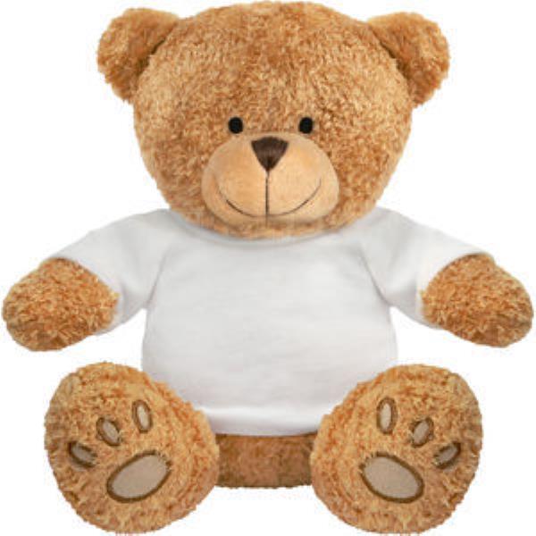 BLANK PLUSH SOFT TOY EDWARD I TEDDY BEAR with White Tee Shirt. Suitable for Sublimation & Tranfer Print. Suitable for All Ages, Machine Embroidered Paws & Facial Features, Seated Height 24cm Approx, Brown Colour Fur - Available in 2 Colours. Minimum Quantity: 10.