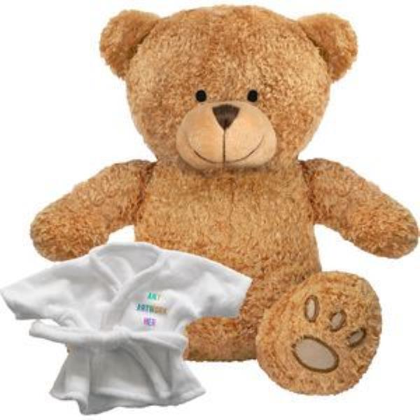 PRINTED PROMOTIONAL SOFT TOY EDWARD I TEDDY BEAR with Dressing Gown. Branded to Your Specification & Personalised in Full Colour. Suitable for All Ages, Machine Embroidered Paws & Facial Features, White Robe with Tie Cord, Seated Height 22cm Approx, Brown Colour Fur - Available in Two Colours. Minimum Quantity: 10.