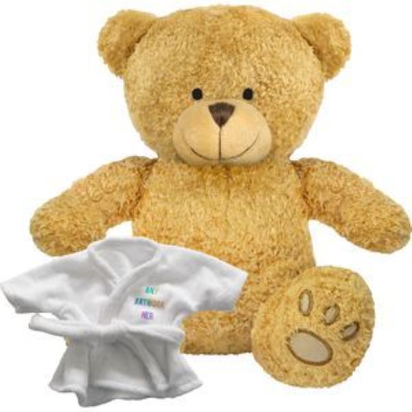 PRINTED PROMOTIONAL SOFT TOY EDWARD II TEDDY BEAR with Dressing Gown. Branded to Your Specification & Personalised in Full Colour. Suitable for All Ages, Machine Embroidered Paws & Facial Features, White Robe with Tie Cord, Seated Height 22cm Approx, Golden Yellow Colour Fur - Available in Two Colours. Minimum Quantity: 10.
