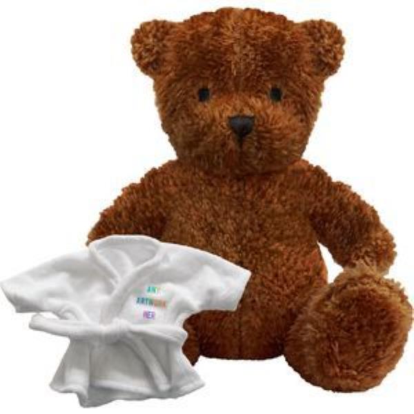 PRINTED PROMOTIONAL SOFT TOY JAMES I TEDDY BEAR with Dressing Gown. Branded to Your Specification & Personalised in Full Colour. James I Plush Toy Bear, Suitable for All Ages, Machine Embroidered Facial Features, White Robe with Tie Cord, Seated Height 17cm Approx, Brown Colour Fur - Available in 3 Colours. Minimum Quantity: 10.