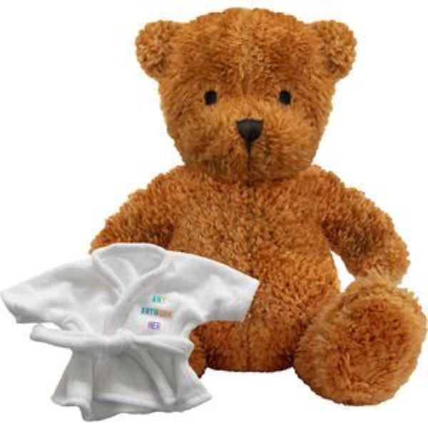 PRINTED PROMOTIONAL SOFT TOY JAMES II TEDDY BEAR with Dressing Gown. Branded to Your Specification & Personalised in Full Colour. James Ii Plush Toy Bear, Suitable for All Ages, Machine Embroidered Facial Features, White Robe with Tie Cord, Seated Height 17cm Approx, Golden Colour Fur - Available in 3 Colours. Minimum Quantity: 10.