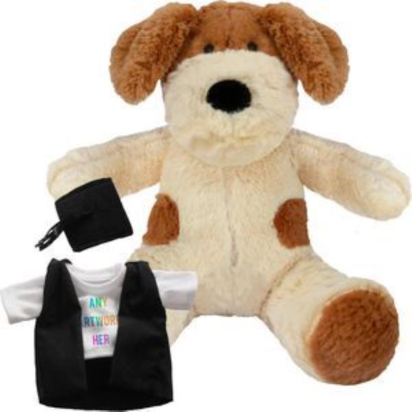 PRINTED PROMOTIONAL SOFT TOY 20CM DARCY DOG with Graduation Outfit. Branded to Your Specification & Personalised in Full Colour. Darcy Dog Plush Toy Suitable for All Ages. with Machine Embroidered Eyes. Black Mortar Board Cap & Graduate Gown, Sitting Height 20cm Approx. Minimum Quantity: 10.