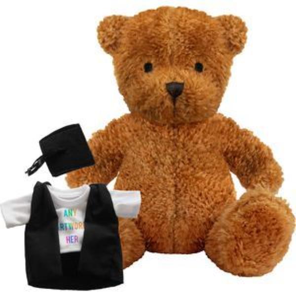 PRINTED PROMOTIONAL SOFT TOY JAMES II TEDDY BEAR with Graduation Outfit. Branded to Your Specification & Personalised in Full Colour. James Ii Plush Toy Bear, Suitable for All Ages, Machine Embroidered Facial Features, Black Mortar Board Cap & Graduate Gown, Seated Height 17cm Approx, Golden Colour Fur - Available in 3 Colours. Minimum Quantity: 10.