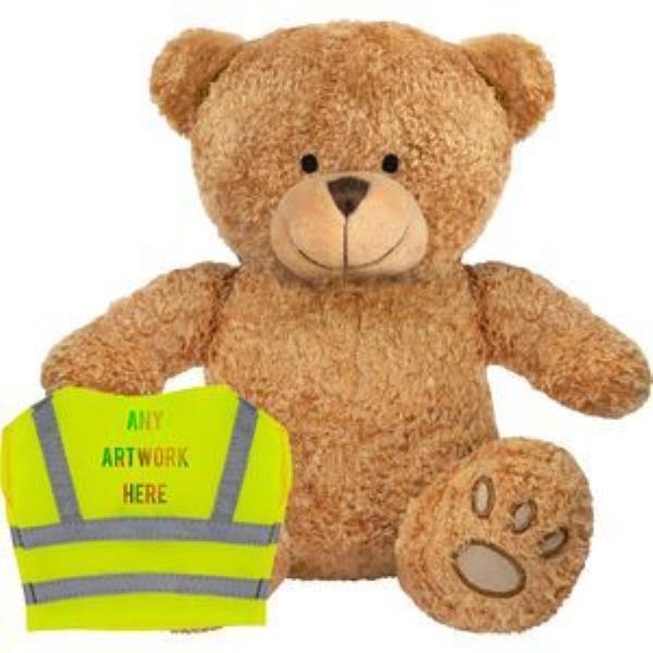 PRINTED PROMOTIONAL SOFT TOY EDWARD I TEDDY BEAR with Hi-vis Vest. Branded to Your Specification & Personalised in Full Colour. Suitable for All Ages, Machine Embroidered Paws & Facial Features, Yellow with Silver Reflective Stripe, Seated Height 22cm Approx, Brown Colour Fur - Available in Two Colours. Minimum Quantity: 10.