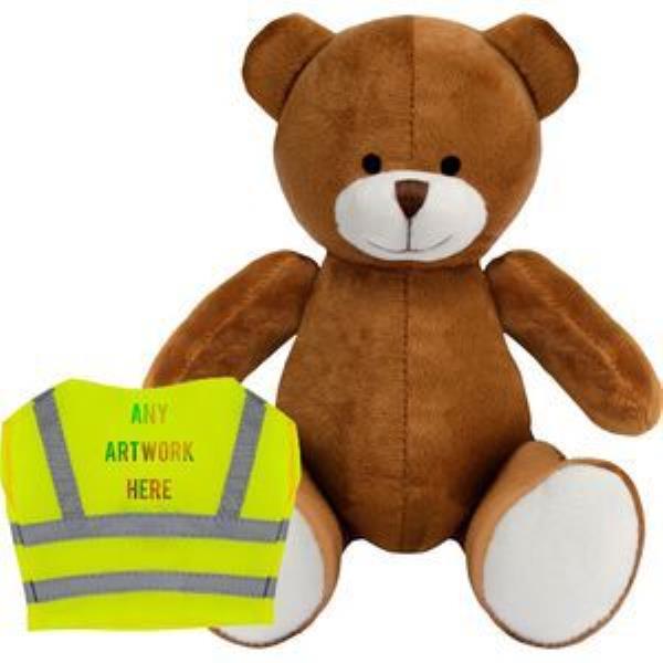 PRINTED PROMOTIONAL SOFT TOY RICHARD TEDDY BEAR with Hi-vis Vest. Branded to Your Specification & Personalised in Full Colour. Richard Plush Toy Bear, Yellow with Silver Reflective Stripe, Suitable for All Ages, Machine Embroidered Facial Features, Seated Height 20cm Approx. Minimum Quantity: 10.