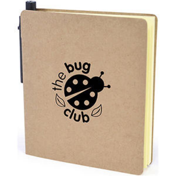 Plain paper notebook with a set of sticky notes, five sets of brightly coloured flags and a mini pen all housed in a recycled paper folder.