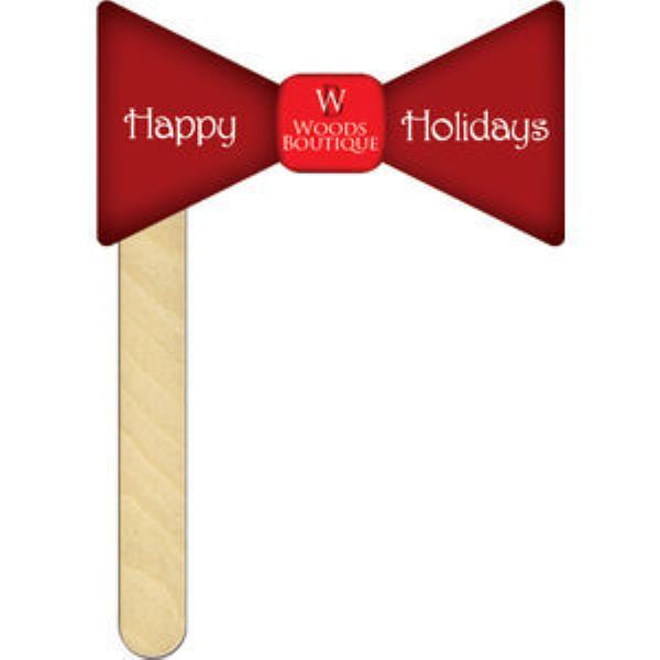 BOW TIE (DIGITAL), Suitable for promotional and party events. Product made of high density 12 pt. White paper board and liquid laminated front with a coated back. Finished with a 15-cm wooden stick. Printed full colour, both sides.