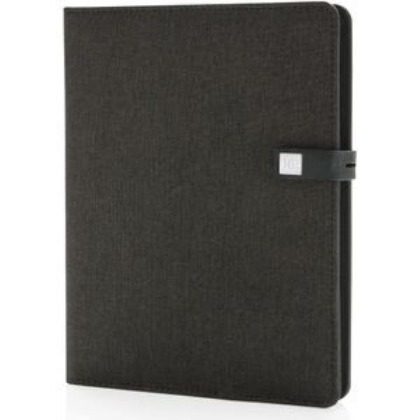 This uniquely designed fabric notebook comes with built in 3000 mAh powerbank and convenient phone stand. Including removable metal 16GB USB 2.0 inside the magnetic closure. Output & input: 5V/1A. Registered design