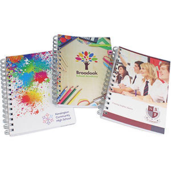 148x210mm. Clear 500 micron polypropylene front and back cover. With a 300gsm front insert printed 4 colour process 1 side with a 1 colour academic calendar to the reverse. 1 x insert with a weekly time table. 50 sheets printed with a weekly planner design (1 colour both sides). Sheets are not dated. 25 sheets printed 1 colour both sides for note taking. 25 sheets printed 1 colour both sides for drawing. Wiro bound on the long edge with silver wire. Bulk packed.
