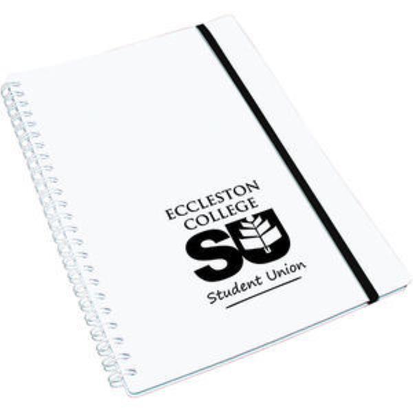148 x 210mm. Containing 50 sheets of white 80gsm paper with a 500 micron polypropylene front and back cover. Wiro bound on the long edge with white wire.Standard elastic colours are black or white only. Bulk packed.