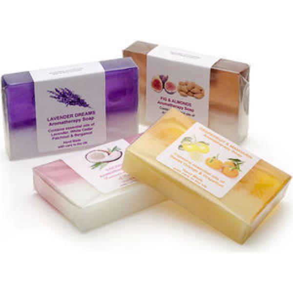 A range of hand made aromatherapy soaps with essentials oils including Lavender Dreams (G505203) Fig & Almond (G505205) Coconut (G505206) and Grapefruit & Mandarin (G505207). Each comes wrapped in a clear wrapper for easy branding. Suitable for all skin types.