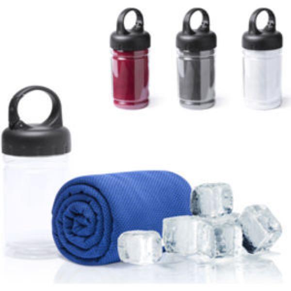 Towel in plastic screw cap container. Towel is made from 55% nylon and 45% polyester. The plastic container has a built in loop and clip. Ideal for sports and the gym.